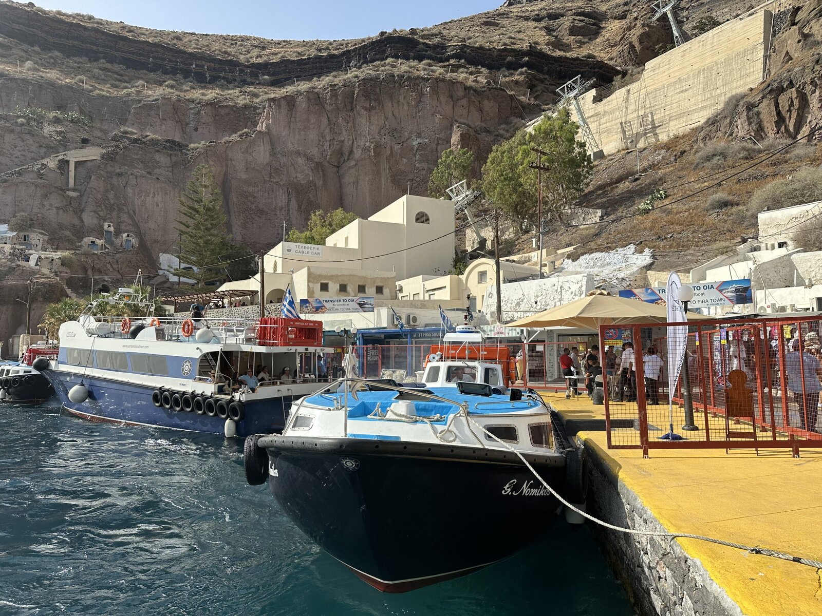 One thing I will say about being one of the last tender groups is that there was not a very long line for the Santorini Cable Cars. This is how you get into town.