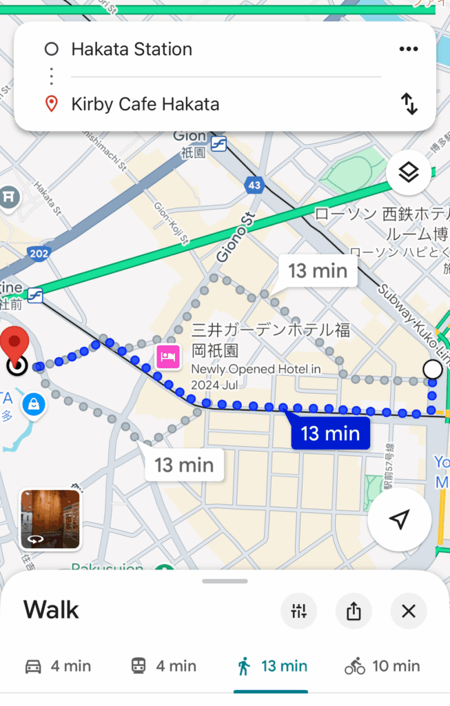 The closest station to Kirby Cafe Hakata is Hakata Station. It is a 13-minute walk from the station.